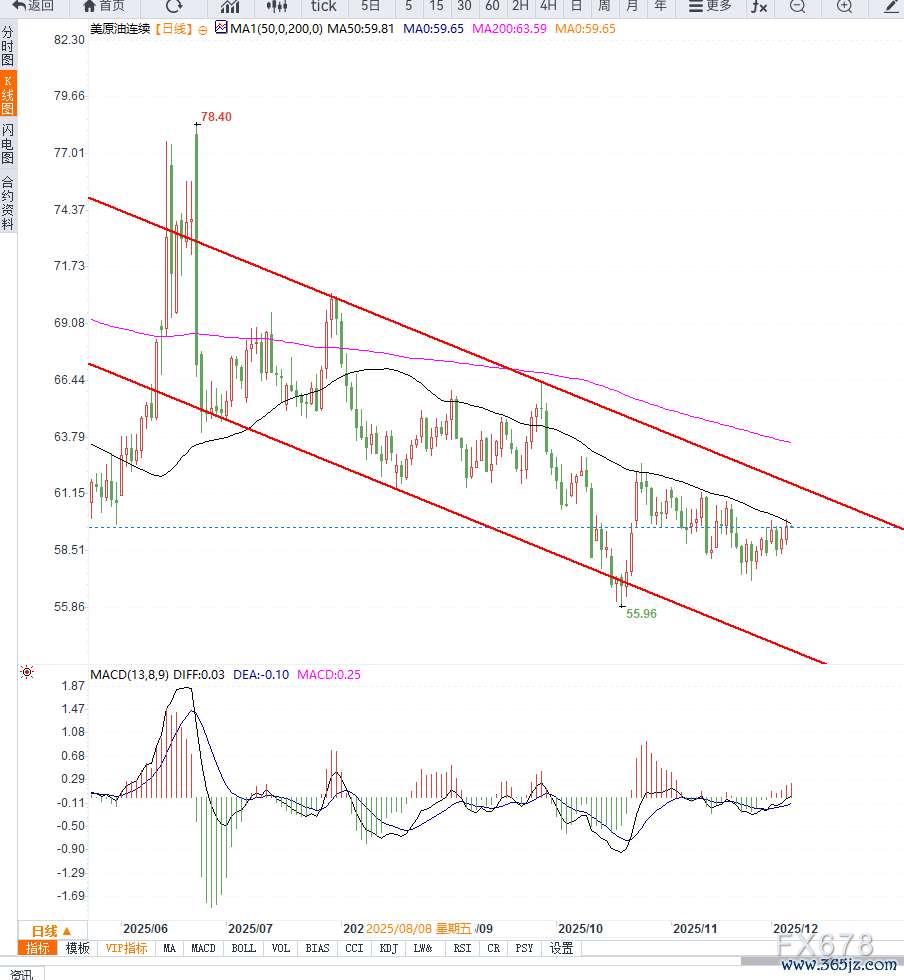 从日线级别不雅察,好意思原油正在从劣势整理向强势反弹结构切换。近期价钱在58好意思元隔邻构筑知道底部后抓续回升,并得胜冲破短期均线粘合区,表露买盘力量渐渐增强。